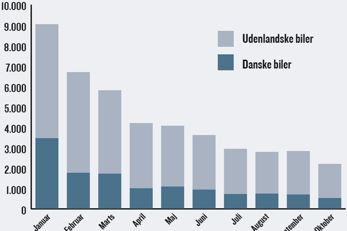 Myndighederne udskrev i oktober 2.175 vejafgiftsbøder. Af dem gik 1.675 bøder til udenlandske lastbiler. Dermed gik over 75 procent af vejafgiftsbøderne i oktober mod cirka 60 procent i starten af året til udenlandske køretøjer. Mens bødeantallet generelt er faldende for både dansk og udenlandske lastbiler, stiger udlændingenes bødeandel altså fortsat.